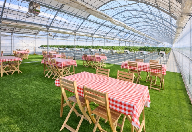 ハウスの中はいつもポカポカ♪ 休憩スペースがございますので、摘み取ったいちごをテーブルでゆっくり味わうことも出来ます。